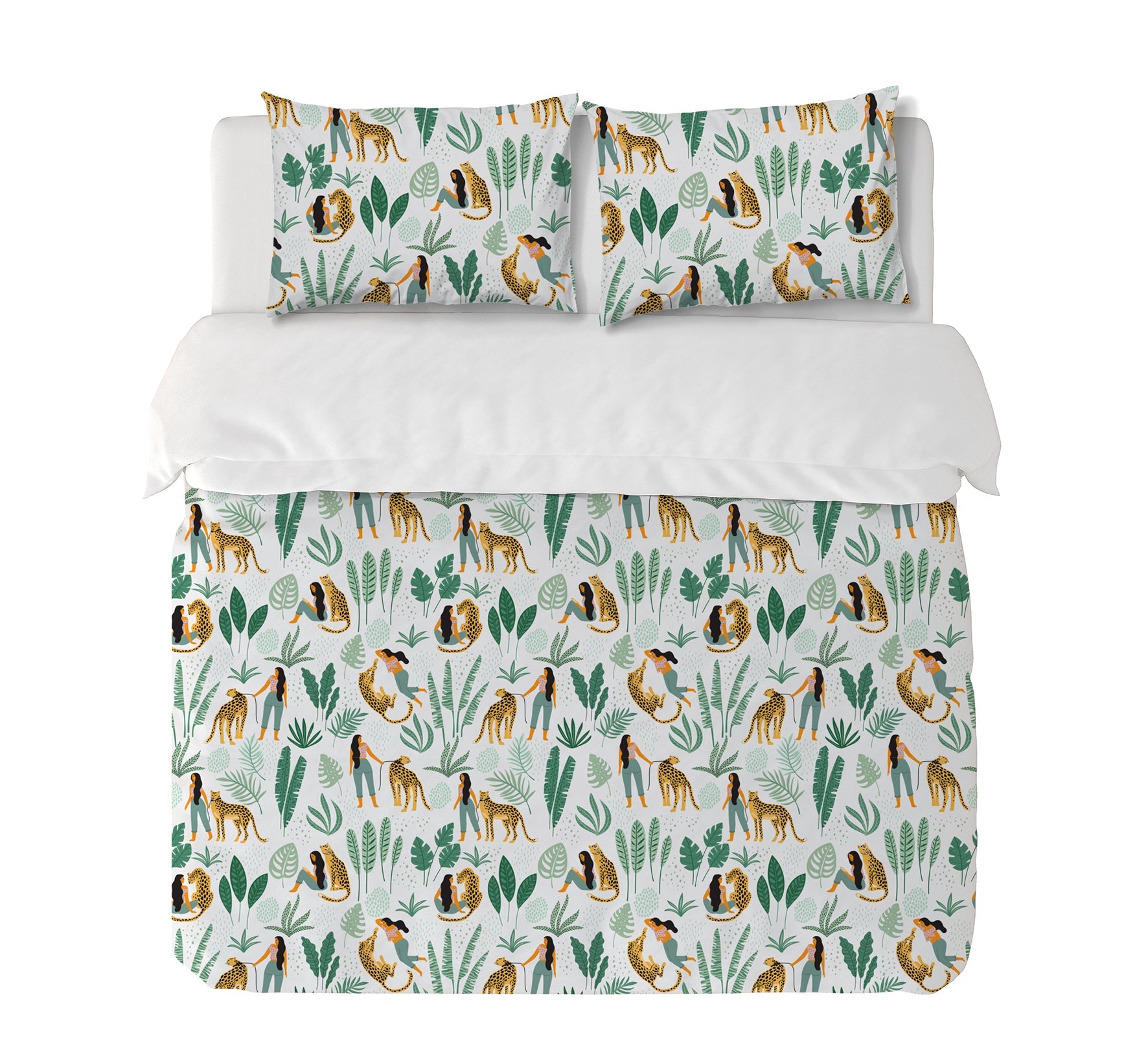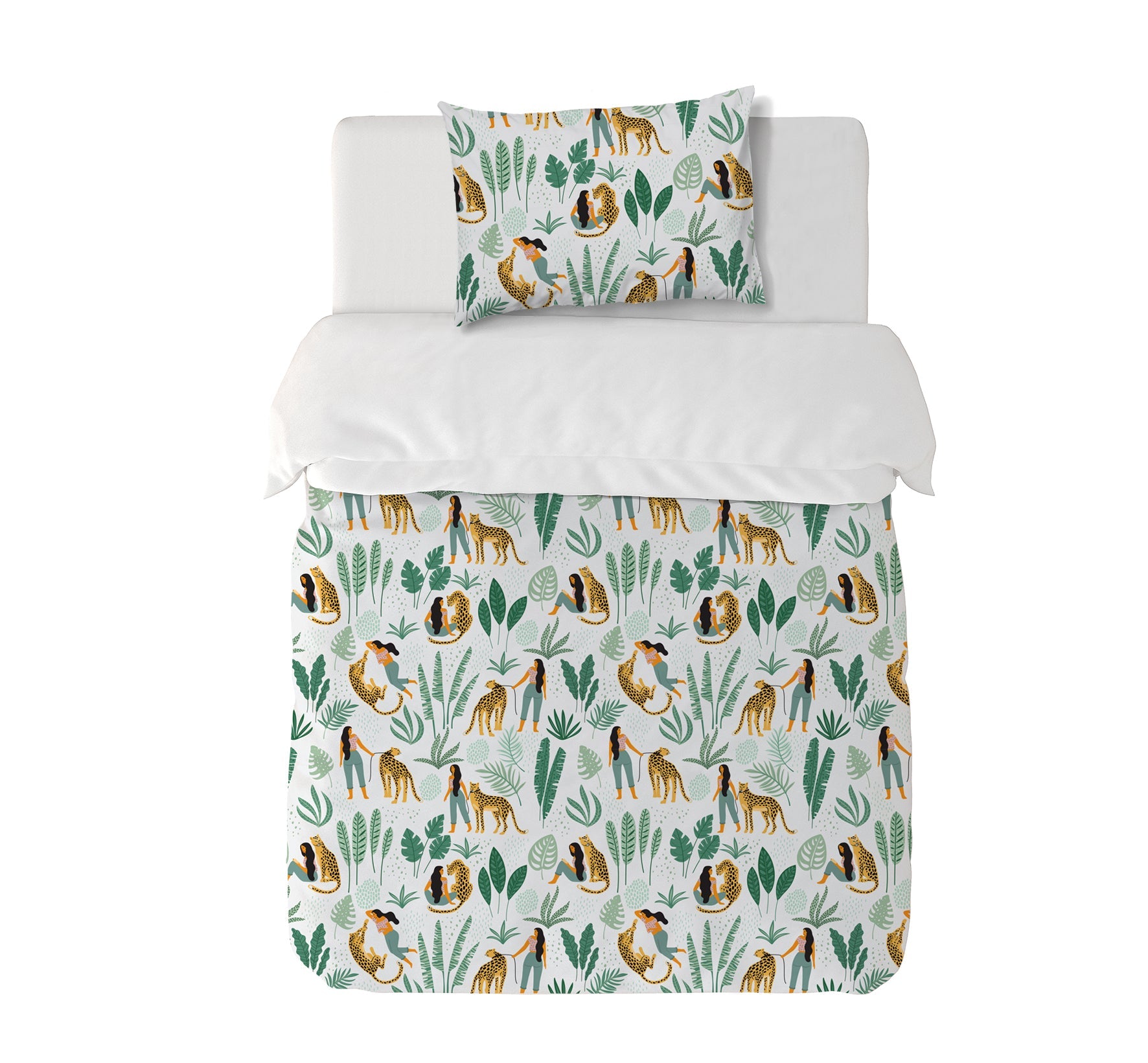 10. Funda de plumón Queen 240 x 245 cm: Funda plumón, diseño por una cara, reverso liso con cierre invisible en la parte inferior + 2 fundas de almohadas 70 x 50 cm con cierre invisible. No incluye rellenos.