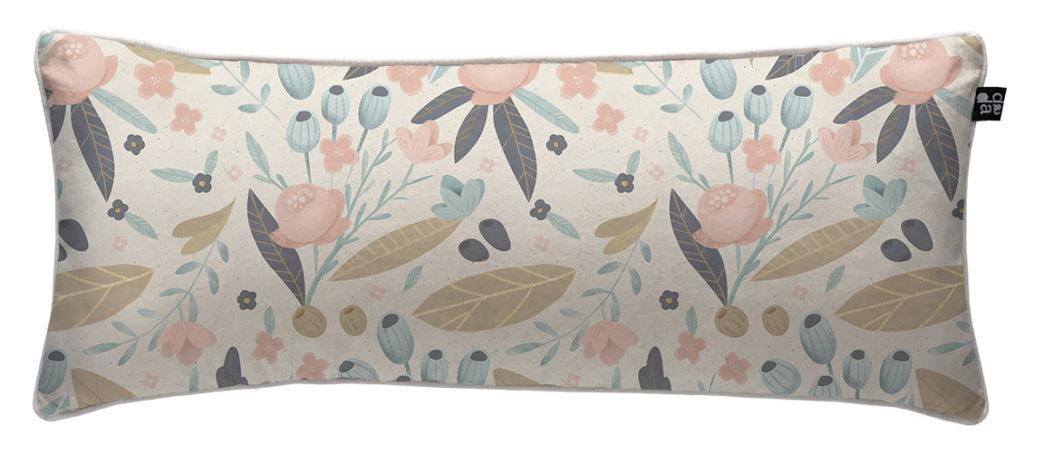 3. Cojín 70 x 35 cm: Diseño por ambos lados, con cordón perimetral, cierre invisible, relleno algodón sintético removible.