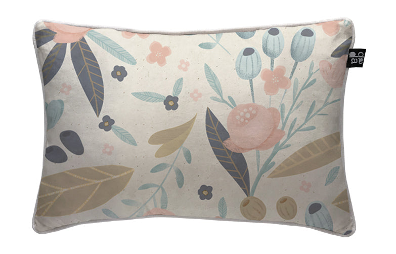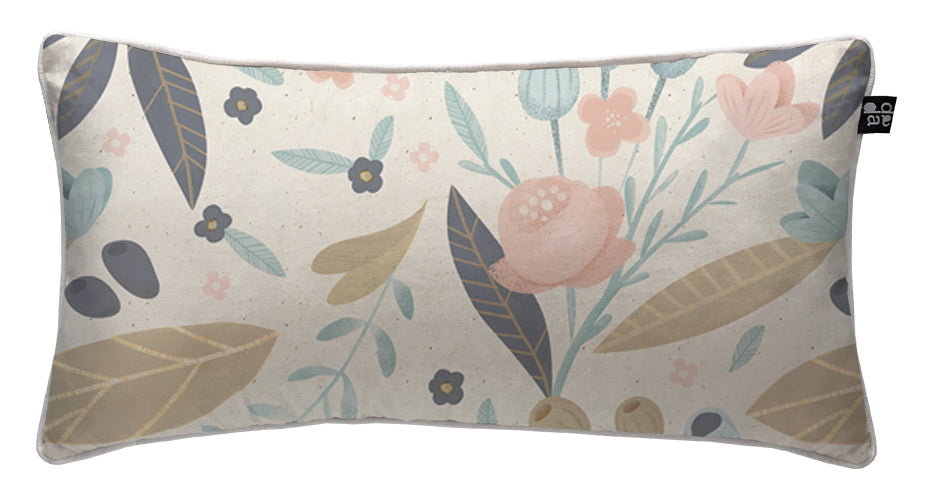 2. Cojín 60 x 40 cm: Diseño por ambos lados, con cordón perimetral, cierre invisible, relleno algodón sintético removible.