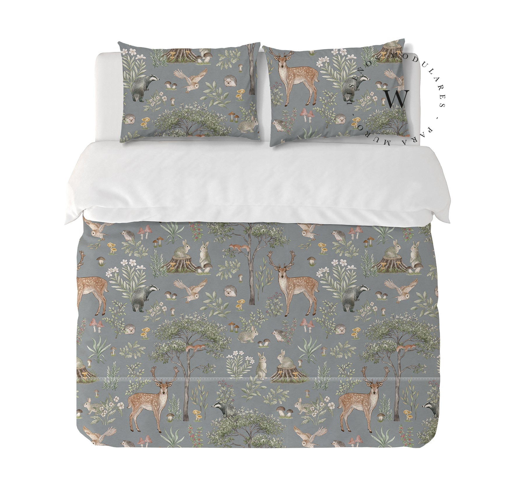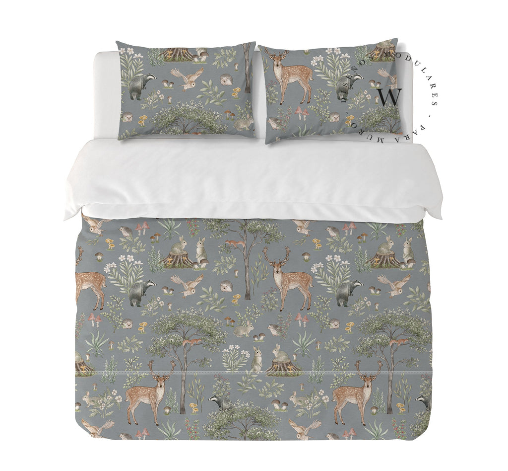 11. Funda de plumón King 270 x 245 cm: Funda plumón, diseño por una cara, reverso liso con cierre invisible en la parte inferior + 2 fundas de almohadas 90 x 50 cm con cierre invisible. No incluye rellenos.