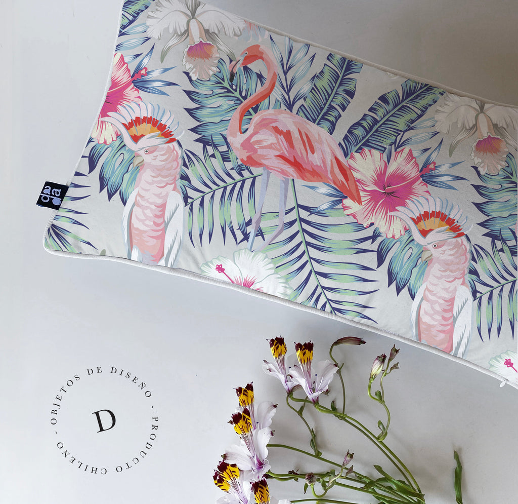 2. Cojín 60 x 40 cm: Diseño por ambos lados, con cordón perimetral, cierre invisible, relleno algodón sintético removible.