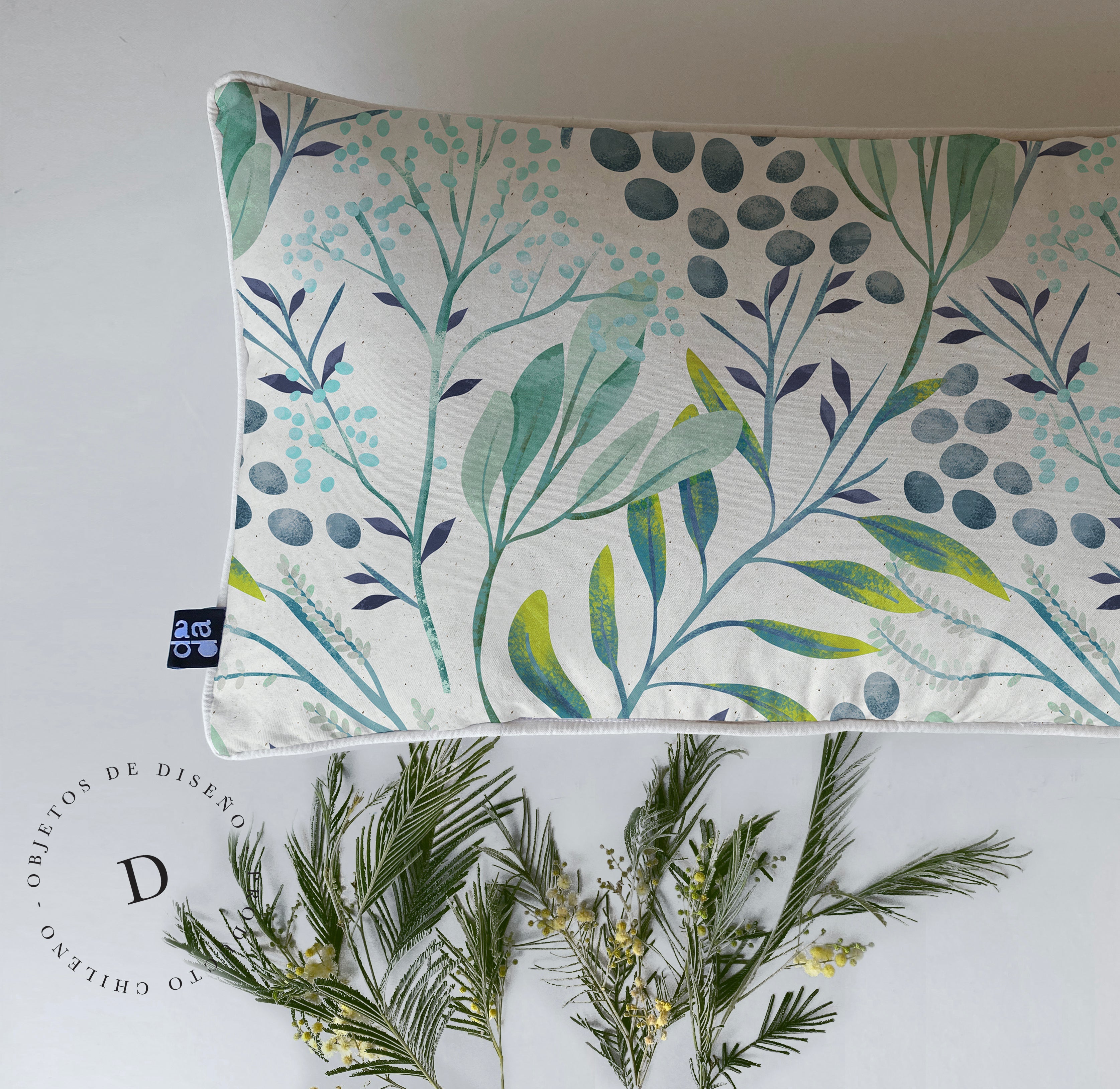 2. Cojín 60 x 40 cm: Diseño por ambos lados, con cordón perimetral, cierre invisible, relleno algodón sintético removible.