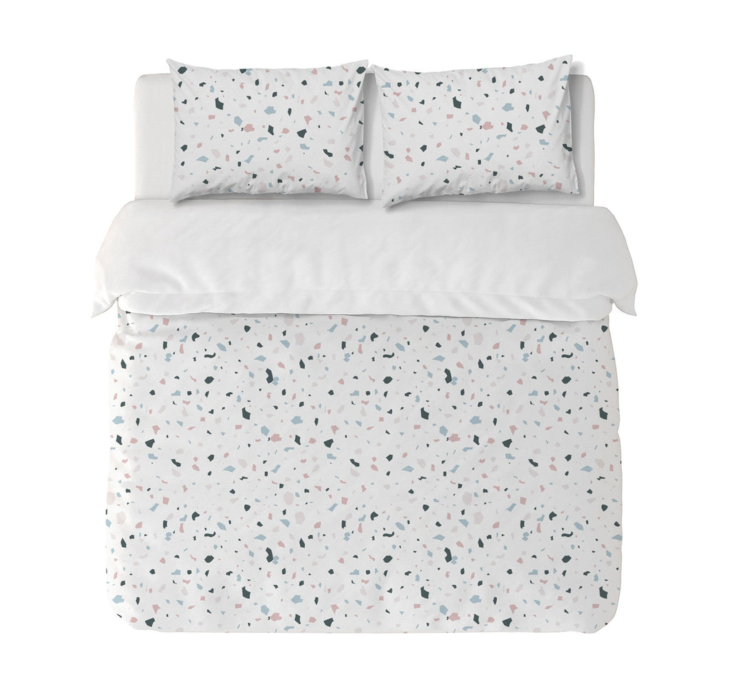 10. Funda de plumón Queen 240 x 245 cm: Funda plumón, diseño por una cara, reverso liso con cierre invisible en la parte inferior + 2 fundas de almohadas 70 x 50 cm con cierre invisible. No incluye rellenos.
