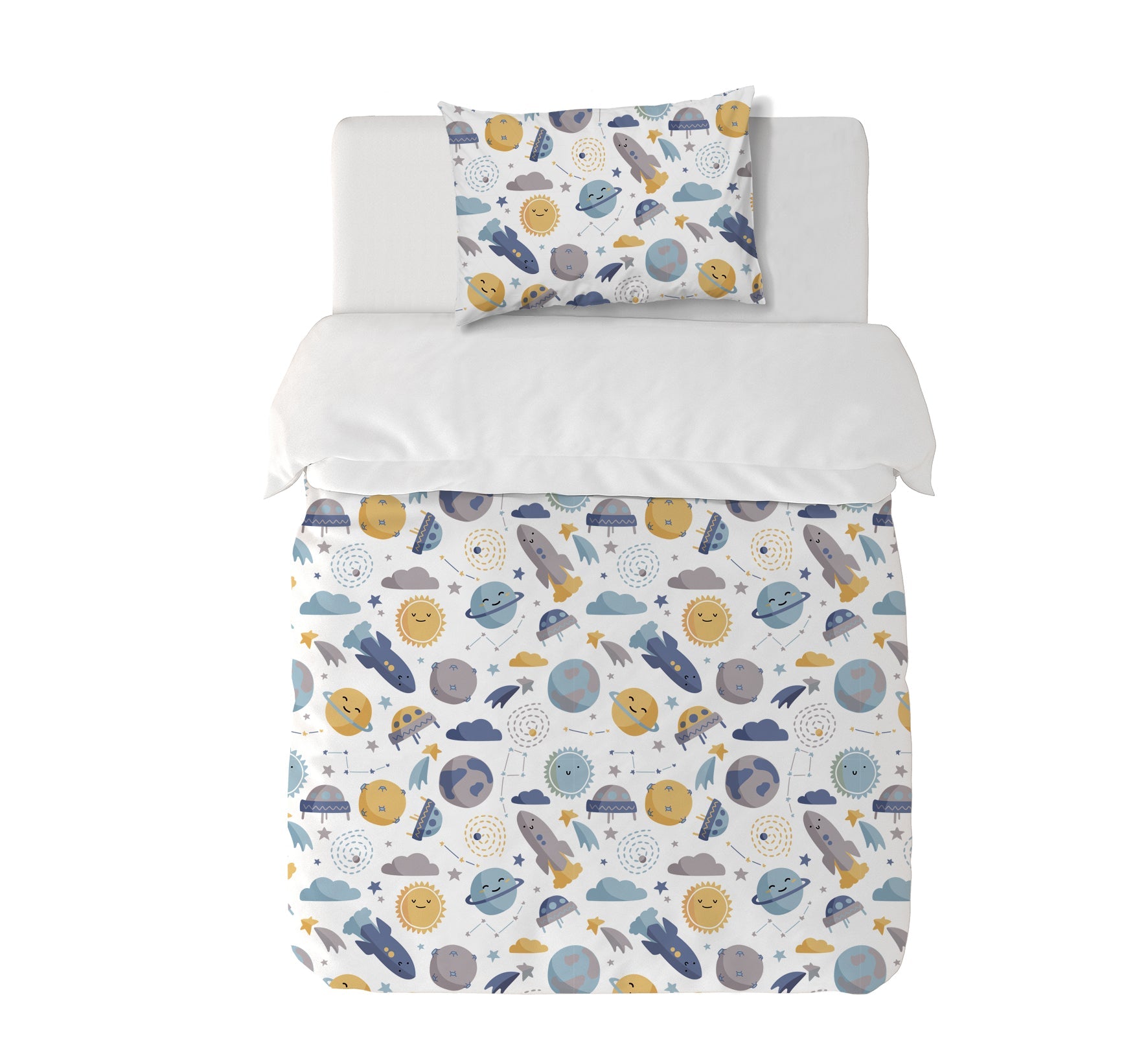 13. Cubrecama Cuna 105 x 145 cm: Cubrecama acolchado, diseño por una cara, reverso liso + 1 funda de almohada 40 x 24 cm con cierre invisible.