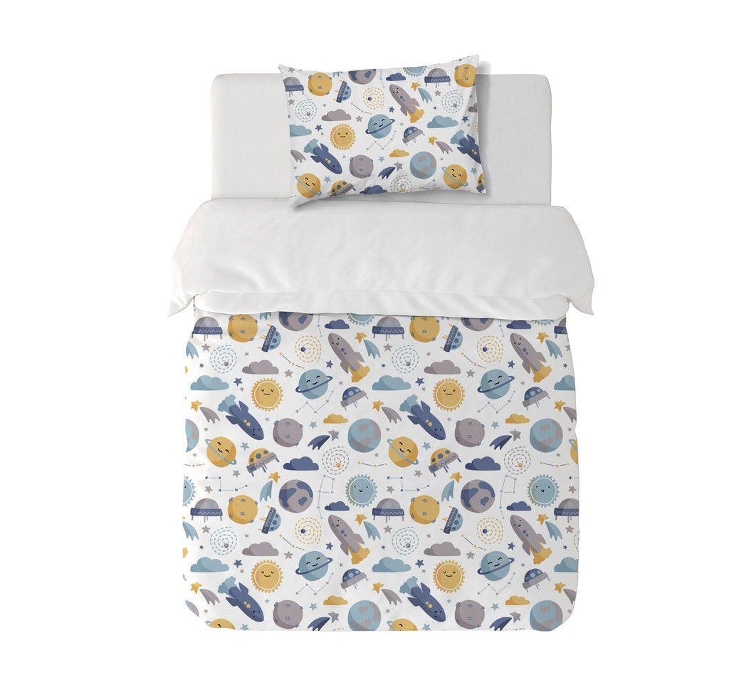 8. Funda de plumón 1 Plaza 150 x 240 cm: Funda plumón, diseño por una cara, reverso liso con cierre invisible en la parte inferior + 1 funda de almohada 70 x 50 cm con cierre invisible. No incluye rellenos.