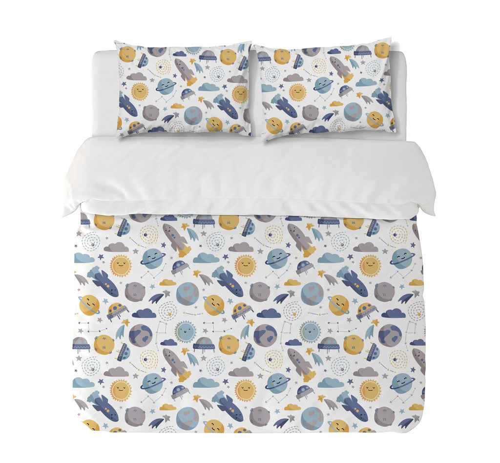 10. Funda de plumón Queen 240 x 245 cm: Funda plumón, diseño por una cara, reverso liso con cierre invisible en la parte inferior + 2 fundas de almohadas 70 x 50 cm con cierre invisible. No incluye rellenos.