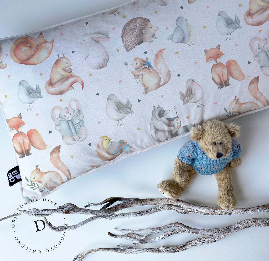 2. Cojín 60 x 40 cm: Diseño por ambos lados, con cordón perimetral, cierre invisible, relleno algodón sintético removible.