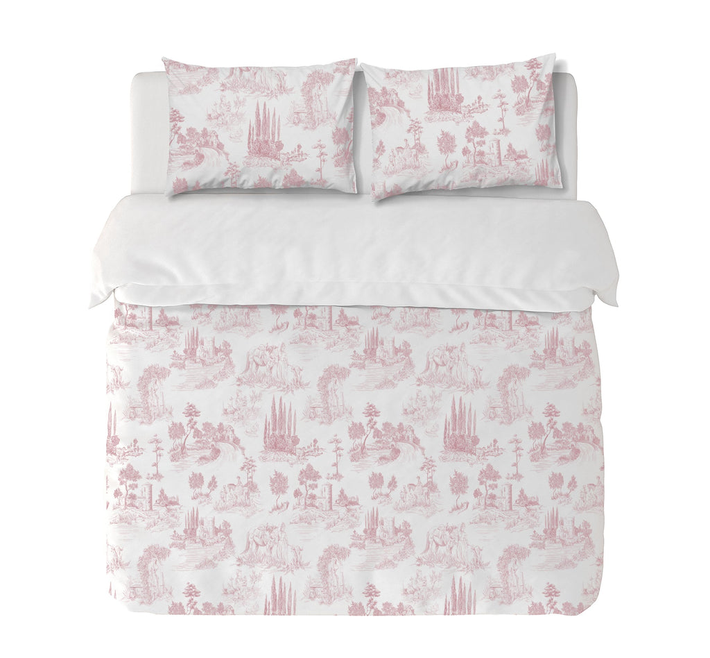 11. Funda de plumón King 270 x 245 cm: Funda plumón, diseño por una cara, reverso liso con cierre invisible en la parte inferior + 2 fundas de almohadas 90 x 50 cm con cierre invisible. No incluye rellenos.