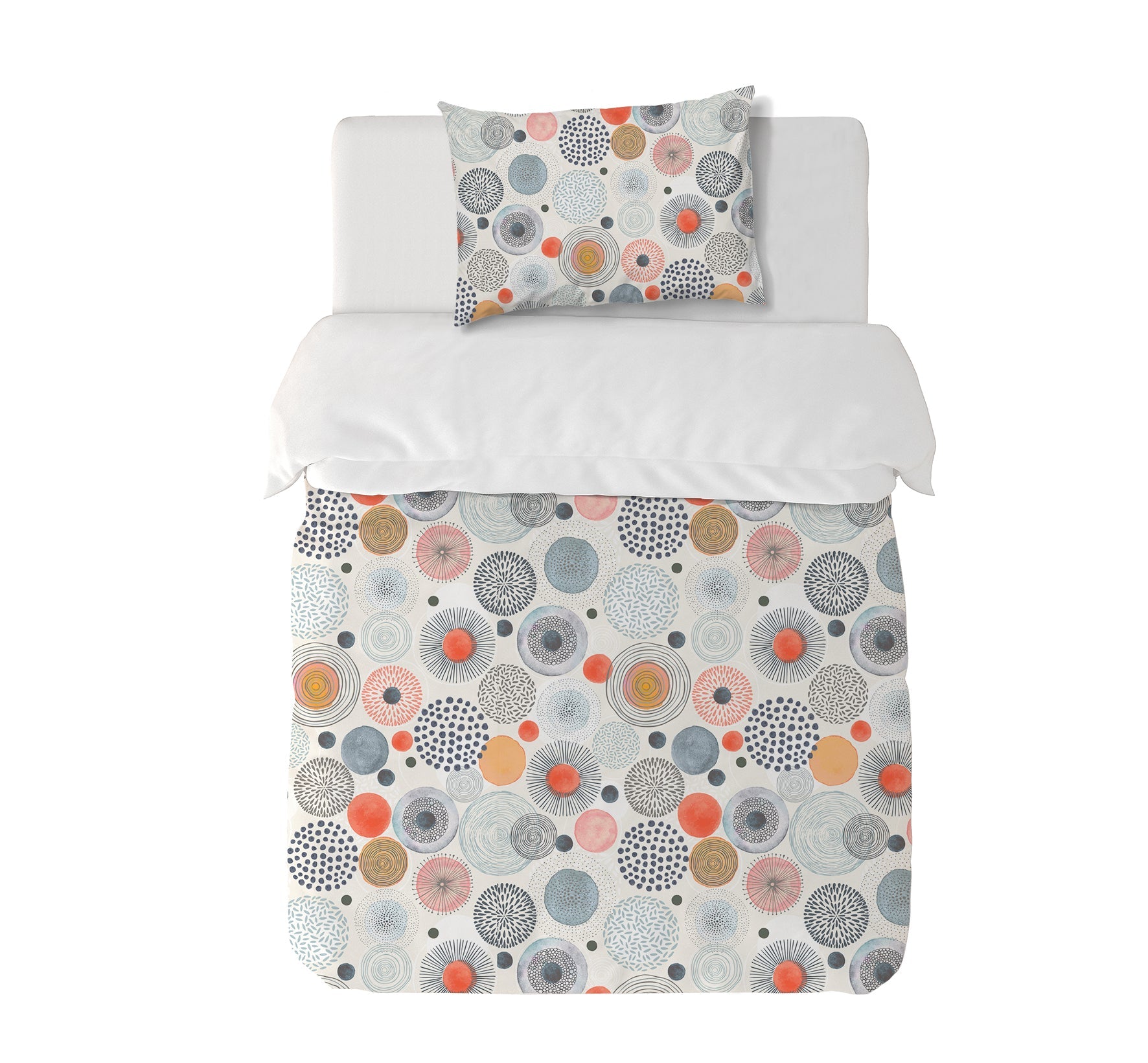 8. Funda de plumón 1 Plaza 150 x 240 cm: Funda plumón, diseño por una cara, reverso liso con cierre invisible en la parte inferior + 1 funda de almohada 70 x 50 cm con cierre invisible. No incluye rellenos.