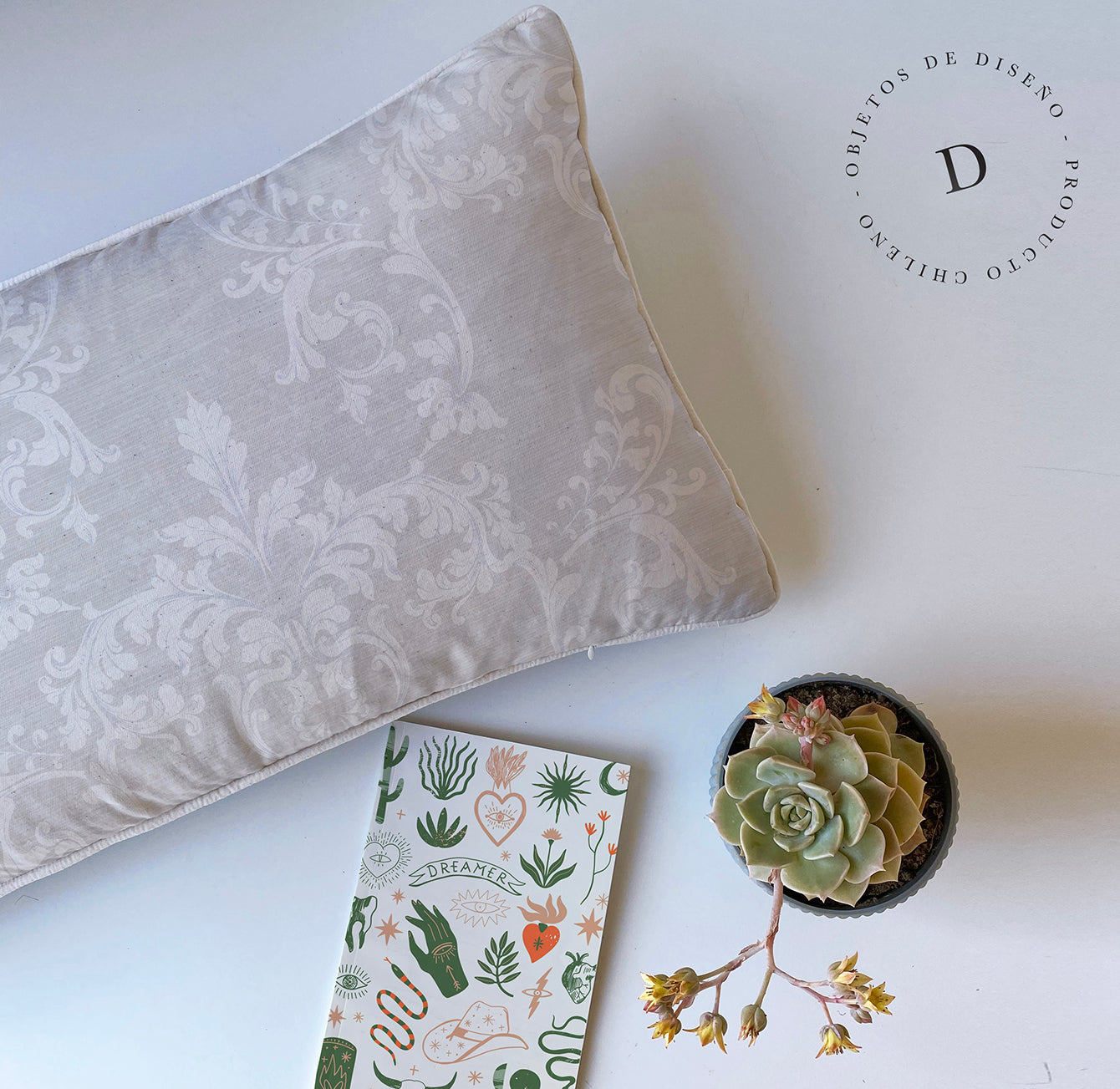 2. Cojín 60 x 40 cm: Diseño por ambos lados, con cordón perimetral, cierre invisible, relleno algodón sintético removible.